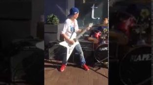 Ένα μικρό αγόρι προσπαθεί να μιμηθεί έναν τράγο, που χτυπά με τα κέρατά του μια μεταλλική πόρτα.