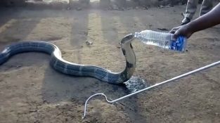 Μια κόμπρα πίνει νερό από μπουκάλι