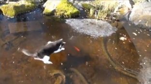 Μια γάτα προσπαθεί απεγνωσμένα να πιάσει ένα ψάρι, που κολυμπά κάτω από την επιφάνεια μιας παγωμένης λίμνης.
