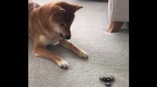Ένας σκύλος προσπαθεί να αντιμετωπίσει με μεγάλη περιέργεια ένα fidget spinner.