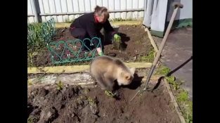 Στη Ρωσία, ένα αρκουδάκι μιμείται μια γυναίκα που σκάβει τον κήπο της για να φυτέψει πατάτες.
