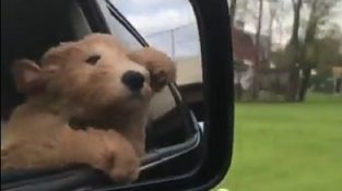 Ένας σκύλος φαίνεται ιδιαίτερα χαρούμενος καθώς κάνει μια βόλτα μέσα σε ένα αυτοκίνητο.