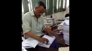 Σε μια δημόσια υπηρεσία στο Πακιστάν, ένας άνδρας σφραγίζει εκπληκτικά γρήγορα μια στοίβα από χαρτιά.