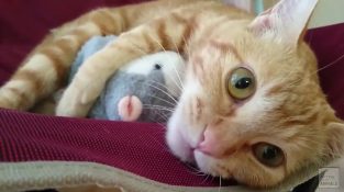 Μια γάτα φαίνεται να βρήκε το αγαπημένο της παιχνίδι, ένα κουκλάκι που επαναλαμβάνει κάθε ήχο που ακούει.