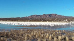Στο καταφύγιο άγριας ζωής Bosque del Apache στο Νέο Μεξικό των Ηνωμένων Πολιτειών, χιλιάδες λευκές χήνες απογειώνονται ταυτόχρονα.