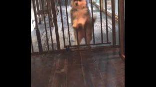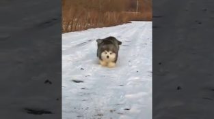 Δύο κουτάβια ράτσας μαλαμούτ Αλάσκας, χοροπηδούν πολύ χαριτωμένα στο χιόνι.