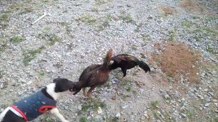 Ένας σκύλος σταματά τον καβγά μεταξύ δύο κοκόρων