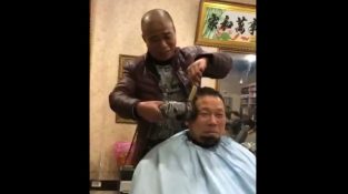 Ένας κουρέας στην Κίνα εφαρμόζει μια πρωτότυπη αλλά και πολύ επικίνδυνη μέθοδο για να κουρέψει τους πελάτες του, χρησιμοποιώντας έναν ηλεκτρικό τροχό.
