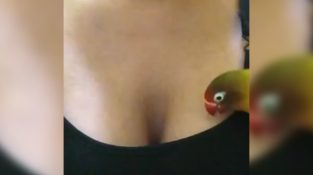 Ένας παπαγάλος έχει βρει το αγαπημένο του σημείο, και ξαπλώνει στο μπούστο μιας γυναίκας.