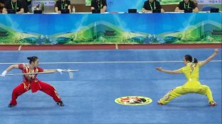 Στο Εθνικό πρωτάθλημα Wushu το 2014 στην Κίνα, δύο γυναίκες (Shen Qing και Zhang Yangyang) κάνουν μια θεαματική επίδειξη της κινεζικής πολεμικής τέχνης.