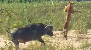 Βούβαλος εκτοξεύει ένα νεαρό λιοντάρι στον αέρα