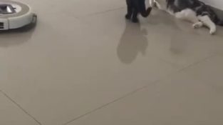 A busy cat repels a roomba by giving it a kick with its hind leg.
