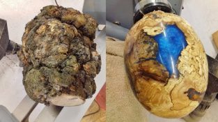 Ο ξυλουργός Andy Phillip φτιάχνει ένα μεγάλο ξύλινο “αβγό δράκου”, βάζοντας ένα κούτσουρο στον τόρνο και προσθέτοντας χρωματιστή ρητίνη.