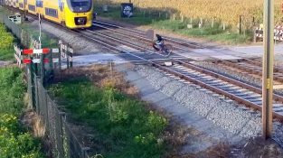 Ένας ποδηλάτης αποφεύγει ένα τρένο καθώς διασχίζει μια μη φυλασσόμενη σιδηροδρομική διάβαση στην Ολλανδία. Ένα πρώτο τρένο κρύβει ένα δεύτερο που περνάει λίγα μόλις εκατοστά από τον ποδηλάτη.