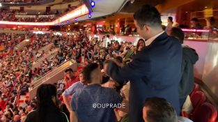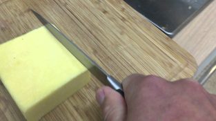 Ο Jasper Russell κόβει ένα κομμάτι τυρί με ένα μαχαίρι, μιμούμενος τον ήχο ενός αλυσοπρίονου.