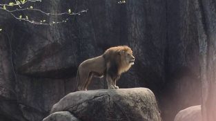 Ένα λιοντάρι γρυλίζει επιβλητικά πάνω σε ένα βράχο, μπροστά στους επισκέπτες του ζωολογικού πάρκου Lincoln στο Σικάγο.