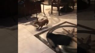 Ένα τσιουάουα κάνει μια άψογη περιστροφή σαν παίκτης του μπάσκετ, για να αποφύγει έναν σκύλο που προσπαθεί να πάρει το παιχνίδι του.