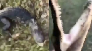 Στη Φλόριντα των Ηνωμένων Πολιτειών, ένας άνδρας πιάνει με το ένα χέρι από τον λαιμό έναν νεαρό Αλιγάτορα και τον ρίχνει μέσα σε μια λίμνη.