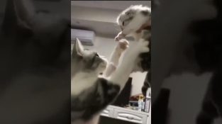 Μια γάτα ζητά να πάρει πίσω το γατάκι της από το χέρι ενός ανθρώπου.