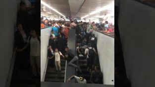 Εκατοντάδες άνθρωποι βρίσκονται στην έξοδο μιας κυλιόμενης σκάλας, προκαλώντας μια επικίνδυνη συμφόρηση.