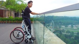 No motors, no batteries. It is a wheelchair for conventional use, with the difference that it has a simple and ingenious system to stand up with your own arms.