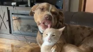 Καθισμένος σε έναν καναπέ, ένας σκύλος δείχνει την αγάπη του σε μια γάτα γλείφοντάς τη στο κεφάλι. Ο σκύλος φαίνεται να συμπαθεί πολύ τη γάτα, αλλά ίσως υπερβολικά. Κάποια στιγμή θα ανοίξει το στόμα του […]