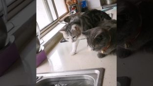 Στον πάγκο της κουζίνας, δύο περίεργες γάτες παρατηρούν ένα ψάρι να κολυμπά στο νεροχύτη. Το ψάρι θα πηδήξει ξαφνικά από το νερό και θα τρομάξει τις δύο γάτες, οι οποίες τρέχουν μακριά.