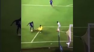 Ένας τερματοφύλακας εκνευρίζεται με τις τρίπλες του αντίπαλου επιθετικού, και του κάνει ένα σκληρό φάουλ.