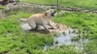 Ένα τυφλό λαμπραντόρ θέλει να παίξει πλατσουρίζοντας μέσα σε μια λακκούβα με νερό.