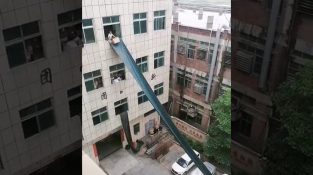 Εργάτες χρησιμοποιούν ένα μακρύ μουσαμά τεντωμένο ανάμεσα σε ένα παράθυρο στον 3ο όροφο ενός κτηρίου και ένα φορτηγό, για να φορτώσουν κουτιά στο όχημα. Γρήγορο και αποτελεσματικό.