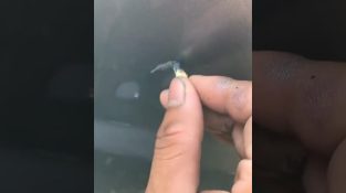Ένας άντρας ρετουσάρει με κόπο μια μικρή γρατσουνιά στο αμάξωμα του αυτοκινήτου του. Λεπτομερής δουλειά.