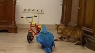 Ένας παπαγάλος δεν θέλει τη γάτα να πλησιάζει κοντά στο καινούριο ποδήλατό του.