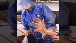 Ένας ψαράς κολλάει ένα χταπόδι στην πλάτη του συναδέλφου του.