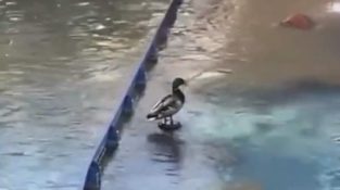Μια πάπια στέκεται πάνω από ένα ακροφύσιο νερού, σε ένα υδάτινο πάρκο. Το ακροφύσιο θα βγάλει ξαφνικά νερό με πίεση, και η πάπια θα εκτοξευθεί στον αέρα. Πολύ πιθανό να καθόταν εκεί επίτηδες.