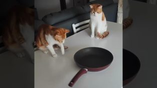 Δυο γάτες περιστρέφουν ένα τηγάνι πάνω σε ένα τραπέζι, και το παρατηρούν με μεγάλο ενδιαφέρον.