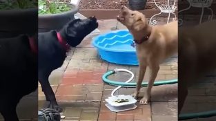Δυο σκύλοι παίζουν με ένα διασκεδαστικό παιχνίδι: μια συσκευή που με το πάτημα ενός πεταλιού απελευθερώνει μικρές ποσότητες νερού στον αέρα.