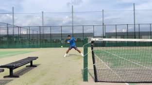 A tennis player tries to imitate one of Roger Federer’s famous shot.