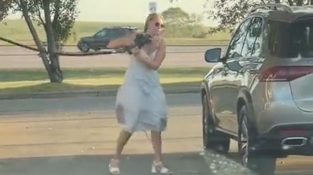 Μια γυναίκα προσπαθεί να βάλει βενζίνη στο αυτοκίνητό της, αλλά το όχημα βρίσκεται πολύ μακρια από την αντλία.