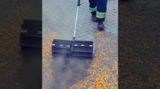 Ένας εργάτης του δήμου καθαρίζει έναν δρόμο χρησιμοποιώντας μια σκούπα εξοπλισμένη με θερμική μηχανή. Η μηχανή περιστρέφει δύο κυλίνδρους που σπρώχνουν τα φύλλα και άλλες βρωμιές με ένα μόνο πέρασμα.