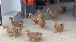 Σε μια γειτονιά στην Κίνα, μια ομάδα από πάπιες περπατούν από πόρτα σε πόρτα φωνάζοντας τους φίλους τους.