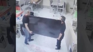 Η αποτυχημένη προσπάθεια δύο ανδρών να εγκαταστήσουν μια τηλεόραση σε ένα τοίχο χρησιμοποιώντας δύο σκάλες.