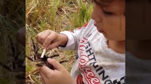 Χωρίς ίχνος φόβου, ένα μικρό αγόρι πιάνει μια ταραντούλα και μας δείχνει πόσο μεγάλα είναι τα δόντια της.