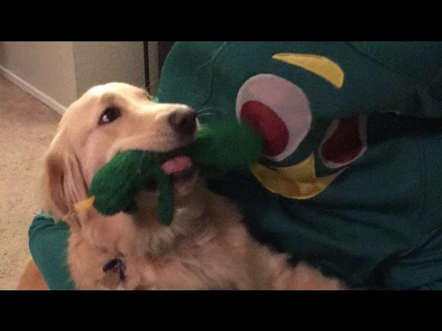 Die Jolene, ein Golden Retriever Hund, Er liebt das Spiel von der Gumby, eine kleine grüne Tröster. Der Chef von gut gekleideten Gumby für Halloween, und Jolene war der glücklichste Hund der Welt. Als er sah, eine live-Version ihrer Lieblings-Game, Er konnte die Freude nicht zurückhalten..