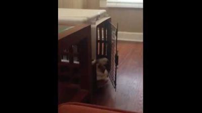 Ein englische Bulldogge Hund liegt in einer Kiste und schiebt die Tür von ihrem Gesicht mit der Pfote weg, als es zurück schwingt und trifft ihr Gesicht immer wieder.