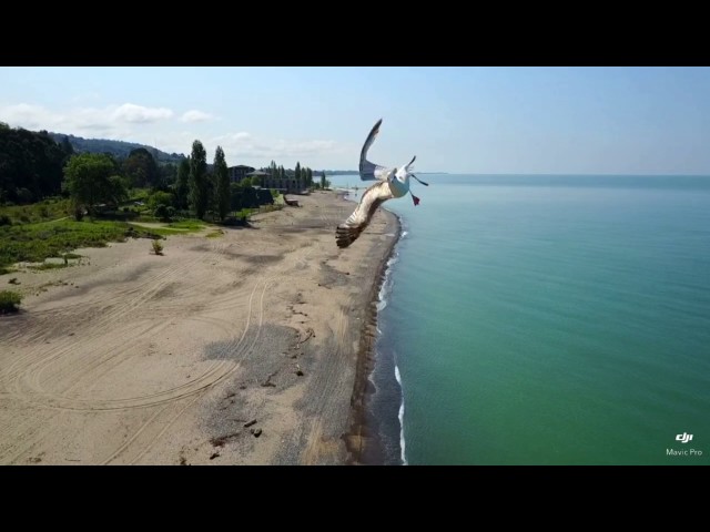 Eine Drohne Mavic Pro bewegte Luft, wenn eine Möwe kommt aufwärts. Die Möwe macht eine beeindruckende Manöver und Konflikte vermeiden.