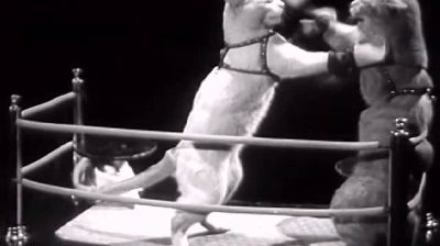 Boxkampf zwischen Katzen mit Hund Publikum im Jahr 1937.