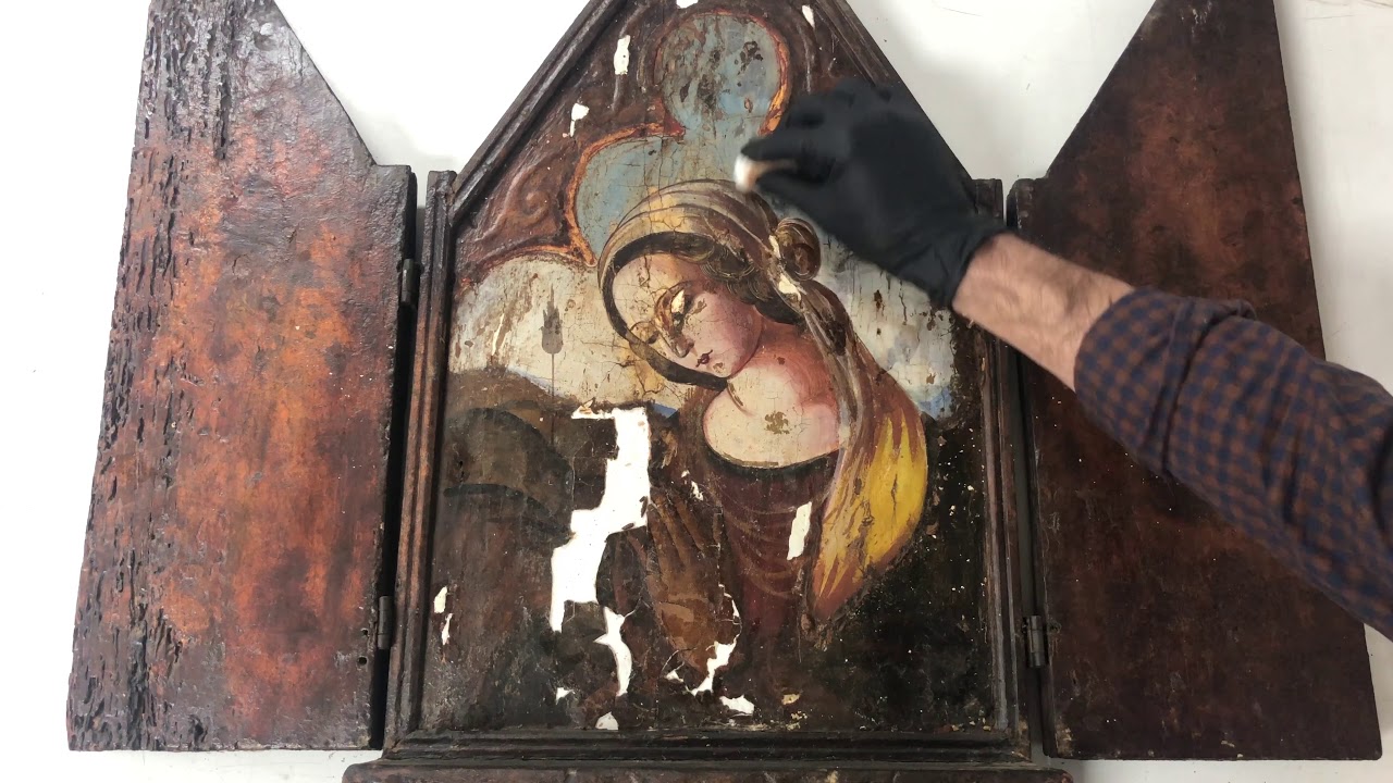 Eine Kunst, Konservator der Firma Baumgartner Restaurierung, restauriert ein sehr altes Gemälde von „Ave Maria“ (Jungfrau Maria Katholische Kirche).