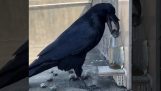 Diese Krähe ist sehr durstig, und versucht zu sagen, die Flasche Wasser zu öffnen.