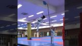 Der Athlet Olly Brücke macht einen großen Sprung über eine Sandinsel in der Stadt Dawlish Warren England.