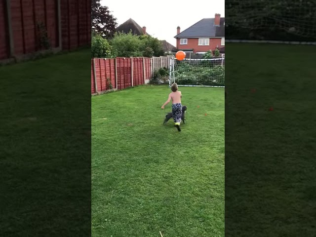 Ein Hund und ein Kind spielt mit einem Ballon